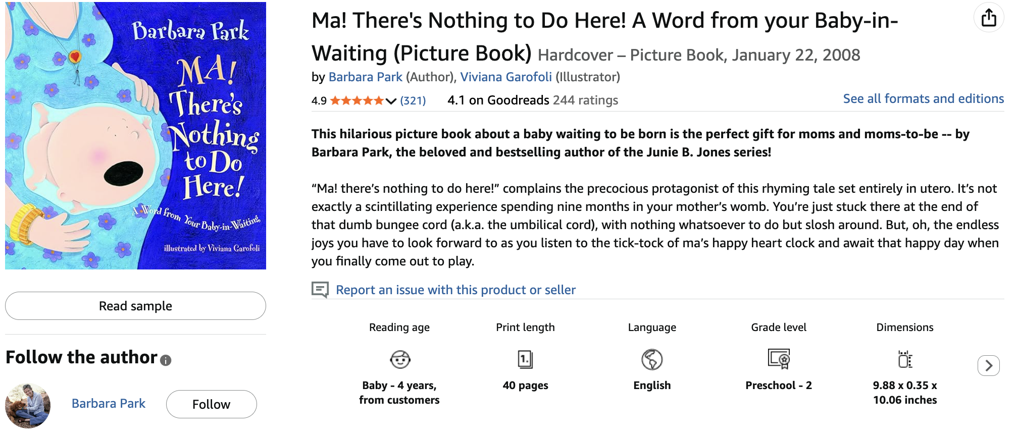 My boys are 13 and 16 now, and reading this book still brings me to tears. It is sweet, conversational, funny, and somehow captures the magic of becoming a parent in the simplest, most beautiful way.